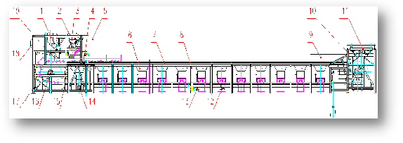 Feeding system: 1. Hearth layer unit 2. Round roller feeding unit 3. Mixture feeding Unit 4. Leveling and blank holding unit 19. Grate pressing unit